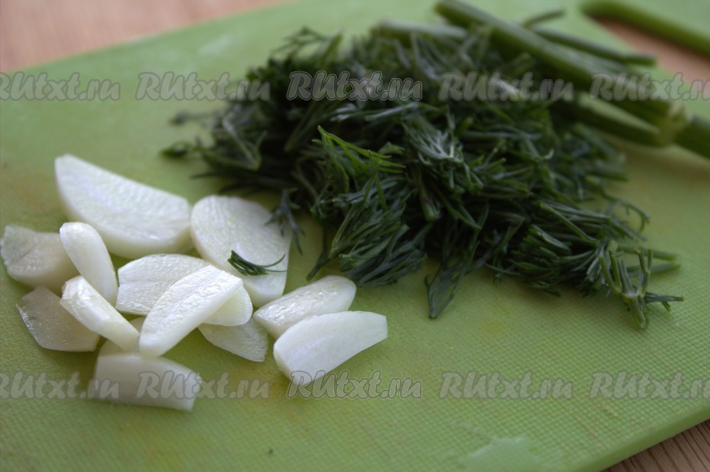 Чеснок очистить и нарезать тонкими пластинами. Вымыть свежий укроп и мелко нарезать.