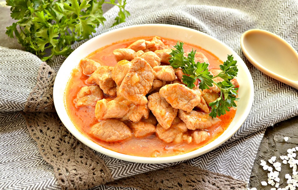 Сытный, сочный, наивкуснейший гуляш из свинины в томатном соусе готов, к столу подаём его с любимым гарниром.