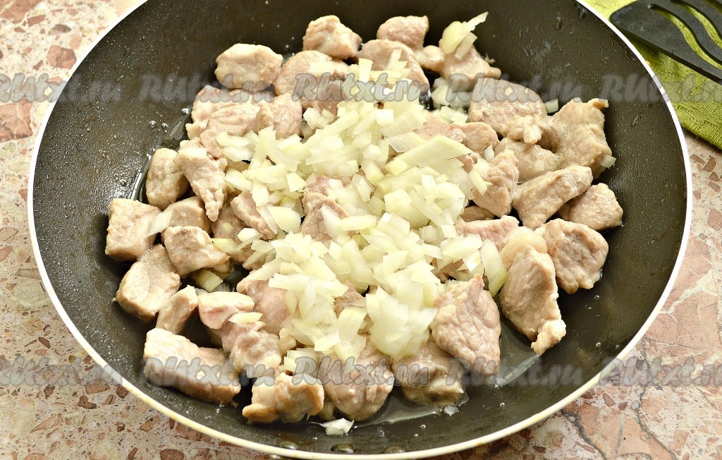 Очищаем лук, нарезаем его кусочками, выкладываем к обжаренной свинине и готовим на среднем огне минут 5, не забывая время от времени перемешивать содержимое сковороды.