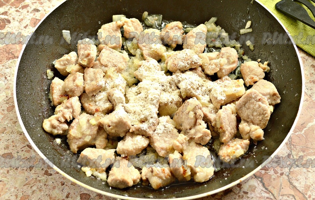 По истечении времени в сковороду всыпаем муку, солим на свой вкус и перчим, перемешиваем, обжариваем ещё 3 минуты.