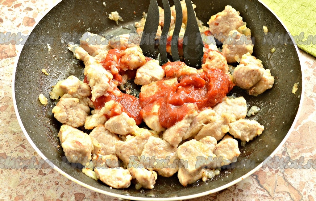 Затем добавляем томатную пасту, хорошо перемешиваем.