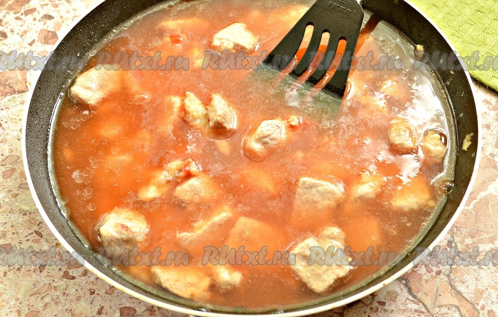 Доводим соус до закипания, убавляем огонь до минимального и томим гуляш из свинины под крышкой 30 минут.