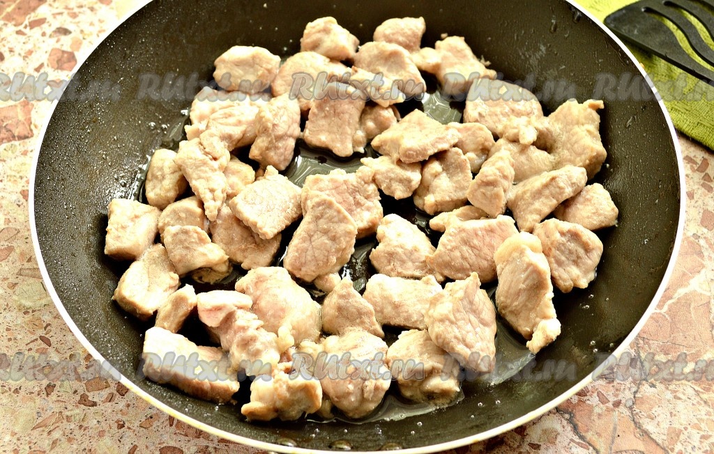 В сковороде разогреваем растительное масло, выкладываем кусочки свинины, обжариваем мясо 5 минут на сильном огне, периодически перемешивая.
