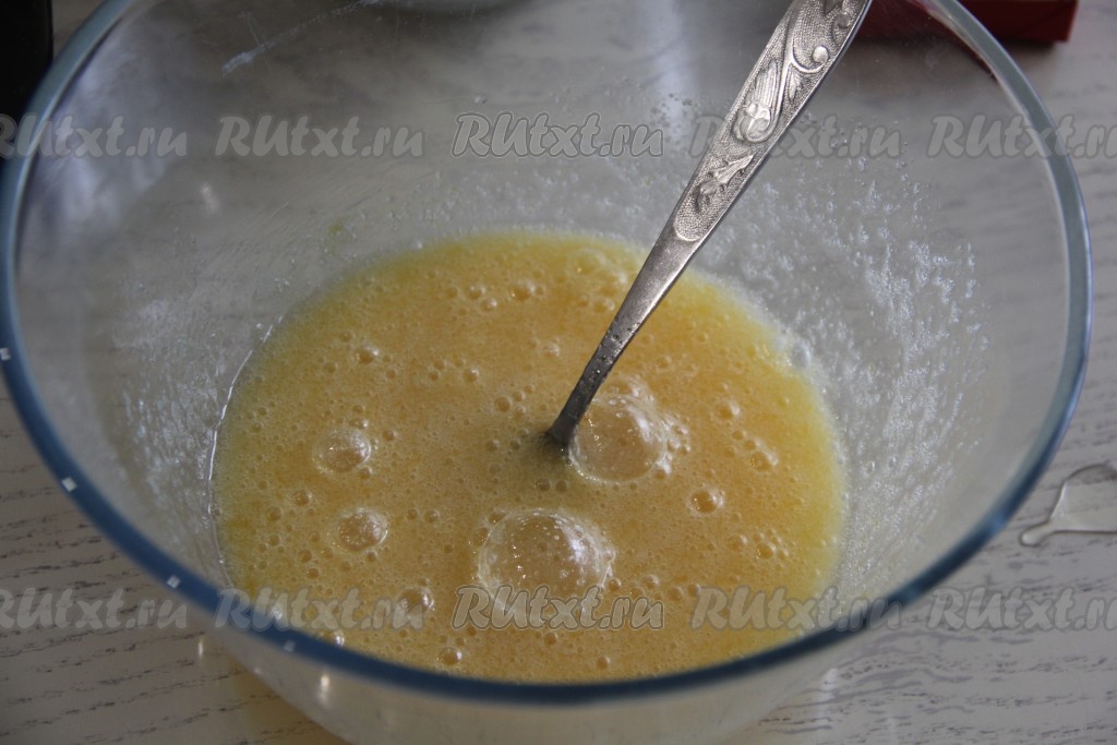 С помощью вилки (или венчика) взбить сахар с яйцами до однородности.