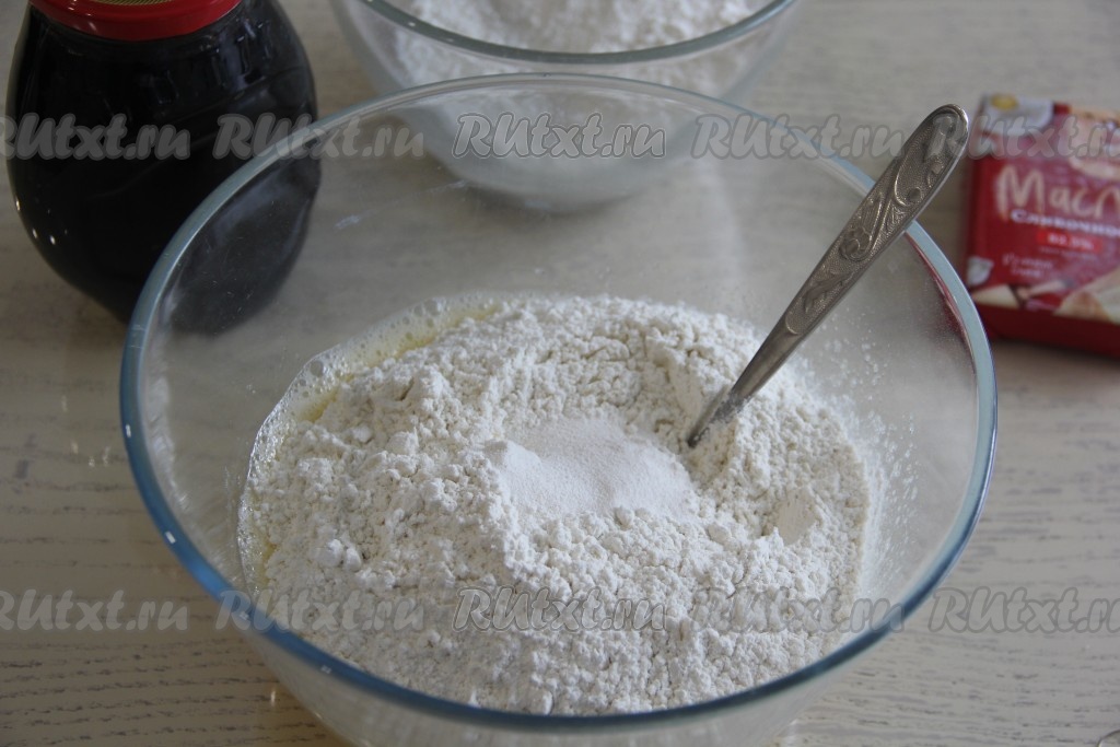 Когда смесь сахара и яиц станет однородной, всыпать в неё муку и разрыхлитель.