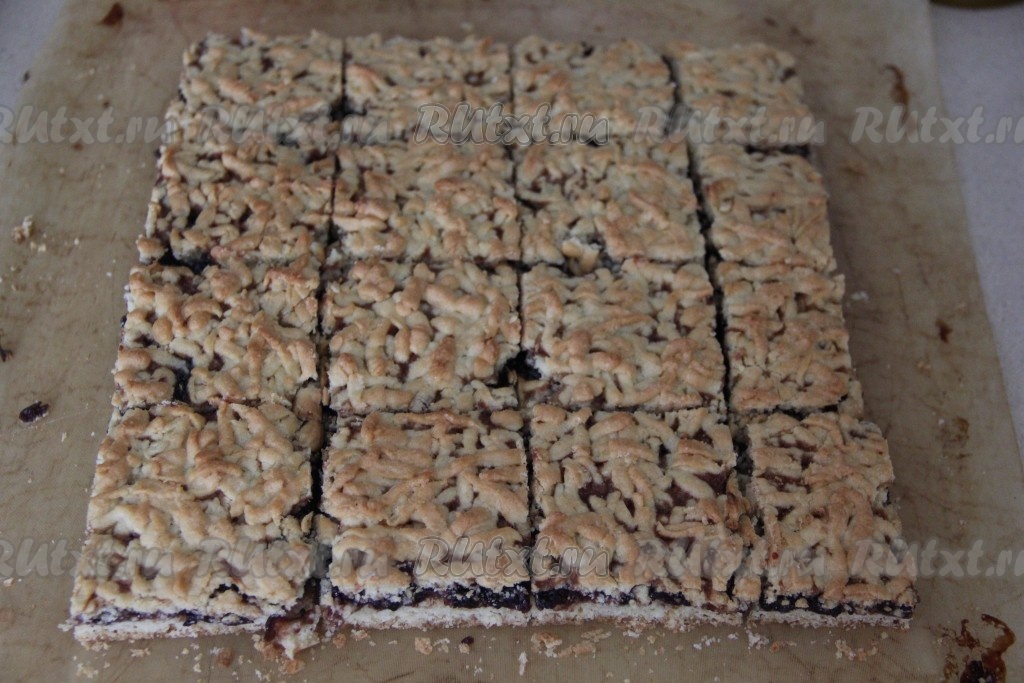 Готовый пирог достать из духовки, оставить до полного остывания (минимум на 2 часа). Затем нарезать на квадратики или ромбики.