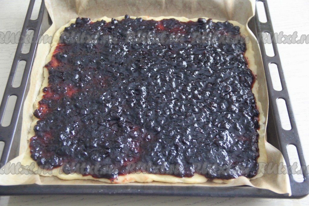 Выложить поверх теста варенье и распределить его равномерно по тесту.