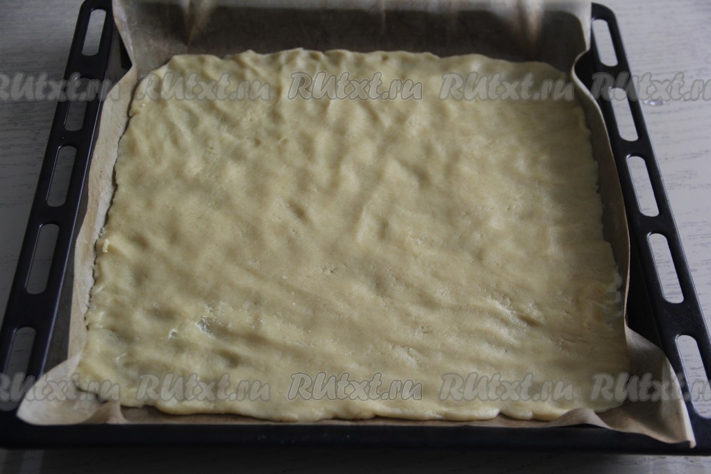 Поместить обе части теста в полиэтиленовые пакеты. Большую часть теста убрать в холодильник, а меньшую - в морозилку на 1 час. Противень застелить пергаментом (у меня противень размером 30 сантиметров на 30 сантиметров). По прошествии часа большую часть теста достать из холодильника, выложить на противень и равномерно распределить по всей поверхности противня.