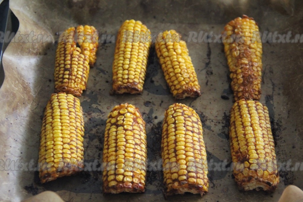 Запекать кукурузу минут 30 (до мягкости зёрен) в духовке, разогретой до 200 градусов.