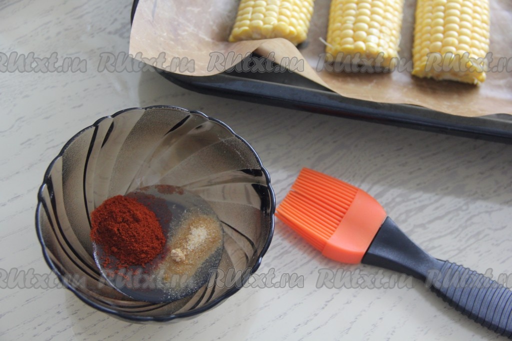Выложить половинки кукурузы на противень, застеленный пергаментом (или тефлоновым ковриком). С помощью силиконовой кисти смазать кукурузу смесью из паприки, масла и специй.