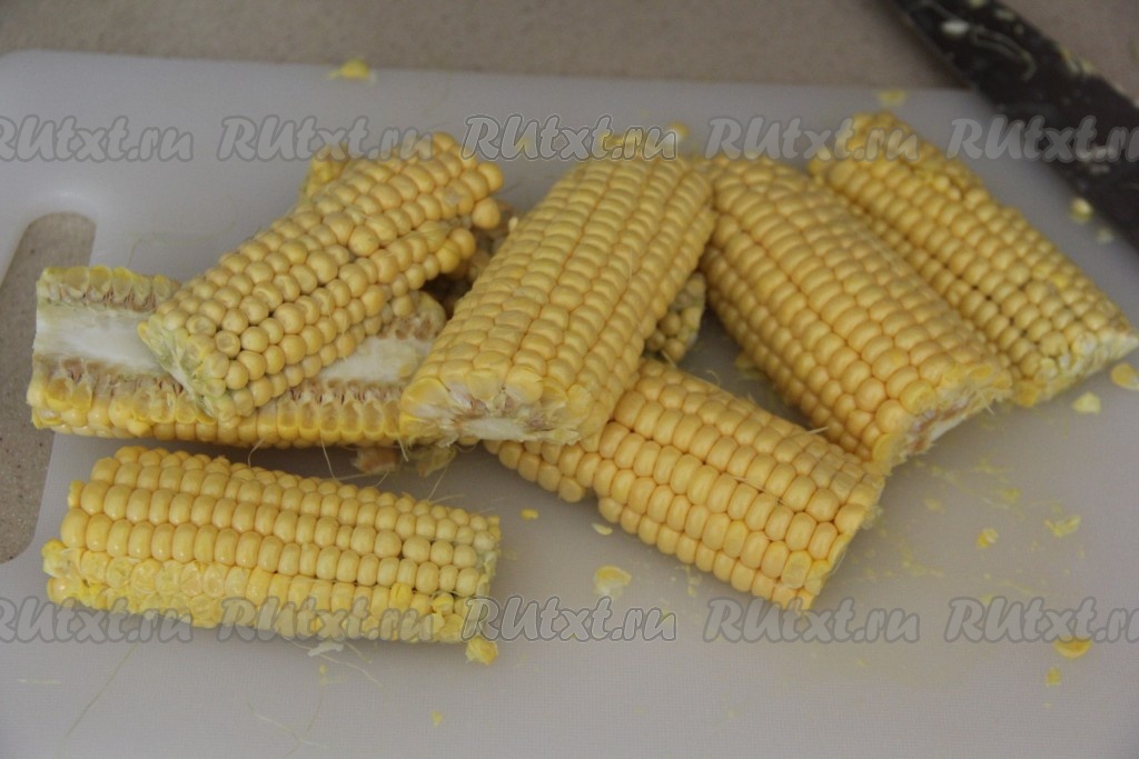 Кукурузу очистить от листьев и волосков, промыть и нарезать на половинки вдоль.