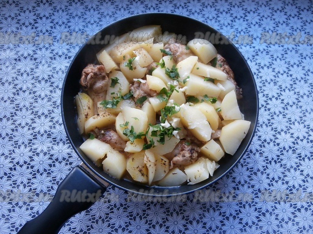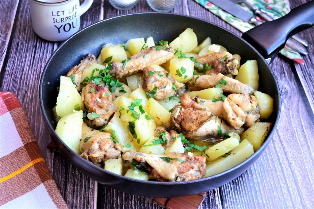 Вкуснейшие куриные крылышки, приготовленные с аппетитной картошкой на сковороде, аккуратно перемешать и подать к столу в горячем виде.