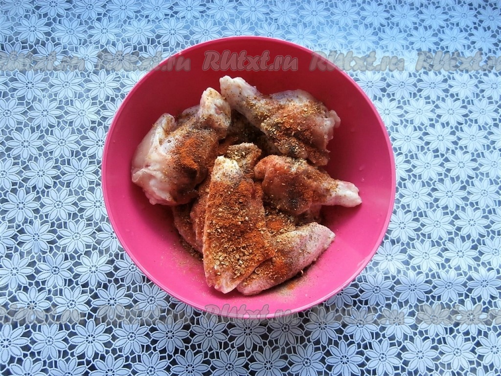 Куриные крылья вымыть, разрезать на 2 части каждое крылышко, удалить кончики. Посолить крылья, поперчить, посыпать специями и паприкой, перемешать.