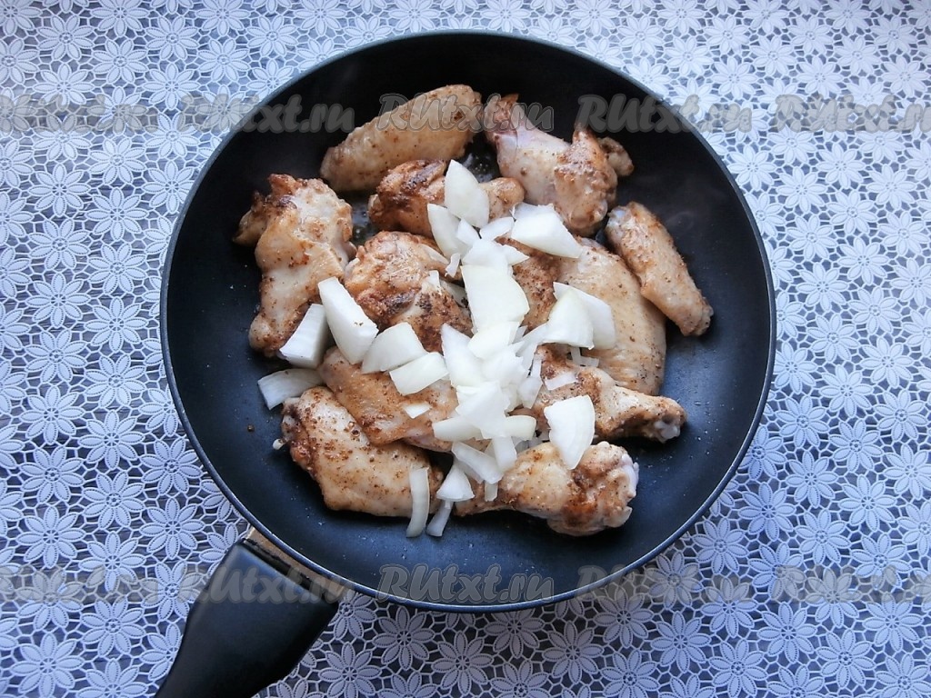 Масло разогреть в глубокой сковороде (я готовила на сковороде диаметром 26 см), выложить крылышки. Обжарить их на достаточно сильном огне до лёгкой румяности со всех сторон, после этого добавить очищенный и произвольно нарезанный лук.