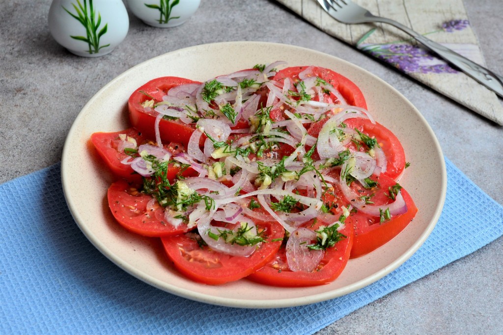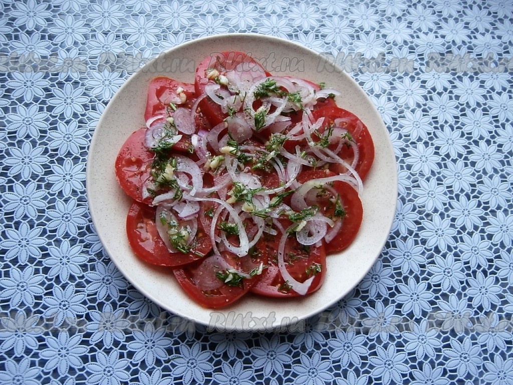 Сверху разместить очищенный репчатый лук, нарезанный тоненькими кольцами (или полукольцами). Снова полить заправкой. Помидоры с луком можно выкладывать, чередуя с заправкой, в несколько слоёв.