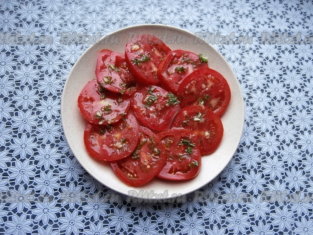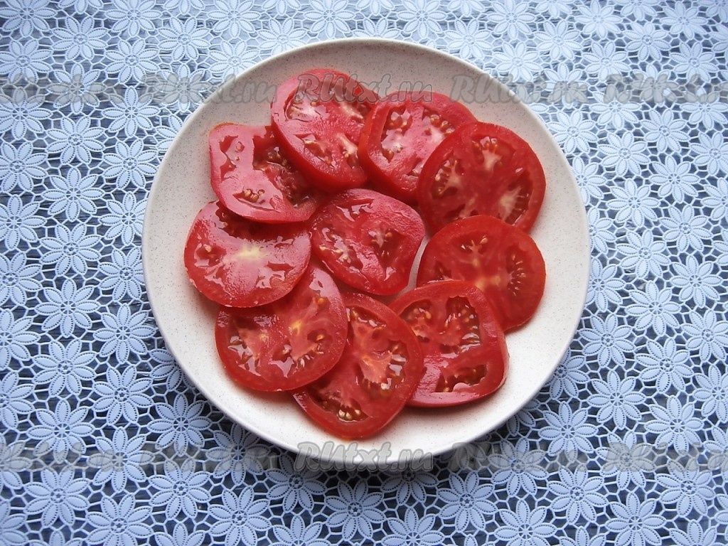 Помидоры нарезать кружочками, выложить в один слой на тарелку.