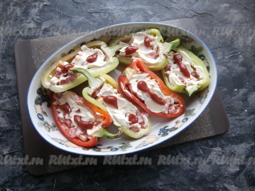 Разместить фаршированные половинки перцев в подходящей форме для запекания, смазать начинку сверху оставшейся сметаной и томатным соусом. Влить в форму растительное масло.