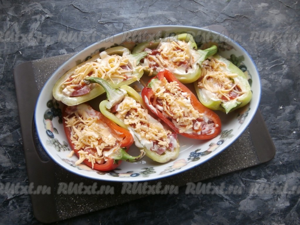 Фаршированные перцы посыпать оставшимся сыром, натёртым на мелкой (или средней) тёрке.