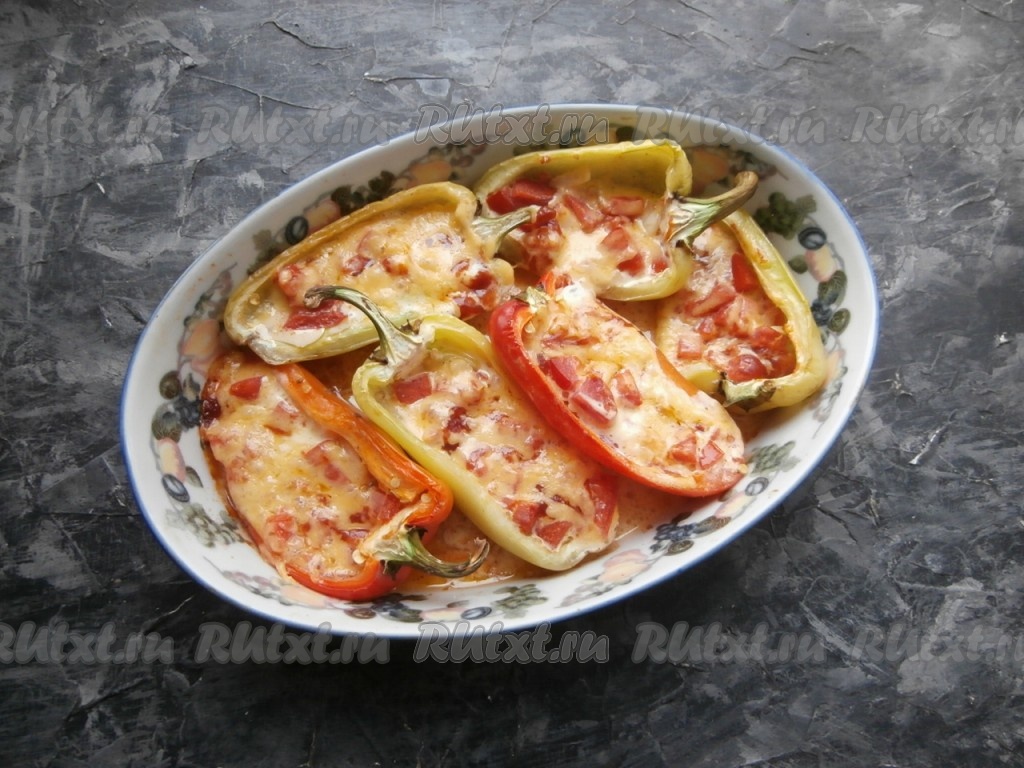 Запекать половинки перца с начинкой из помидоров и сыра в разогретой духовке 25-35 минут при температуре 180 градусов.