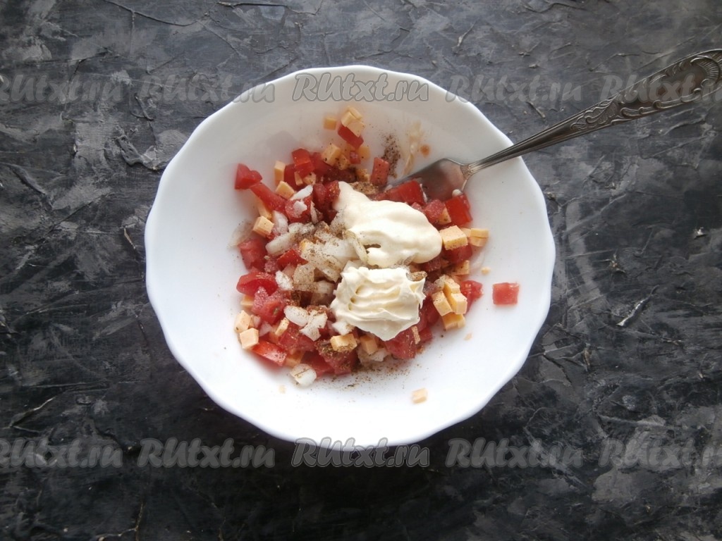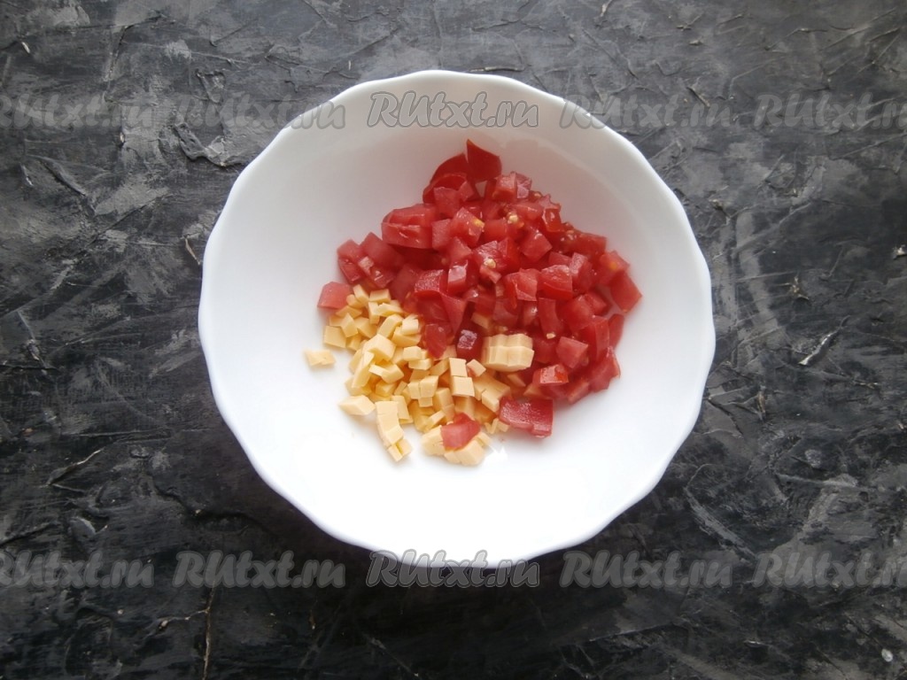 70 грамм сыра и свежие помидоры нарезать маленькими кубиками, выложить в достаточно глубокую тарелку.