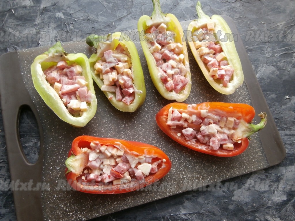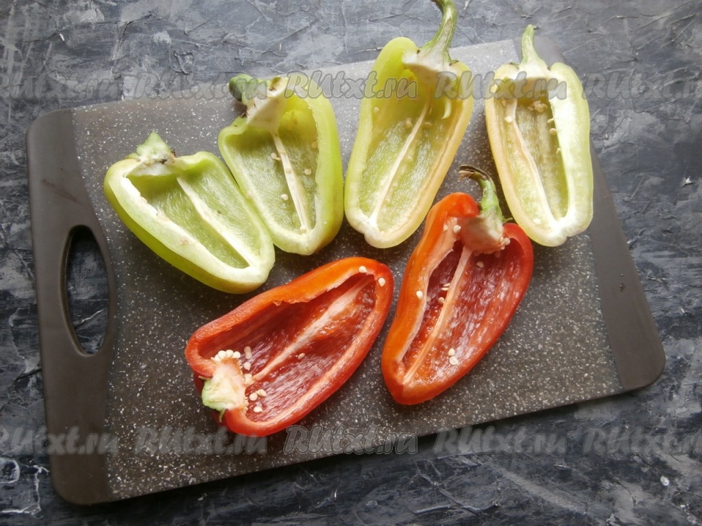 Перец разрезать вдоль на 2 половинки, удалить семена, хвостик можно оставить.