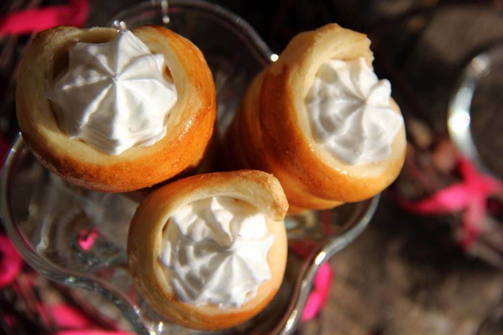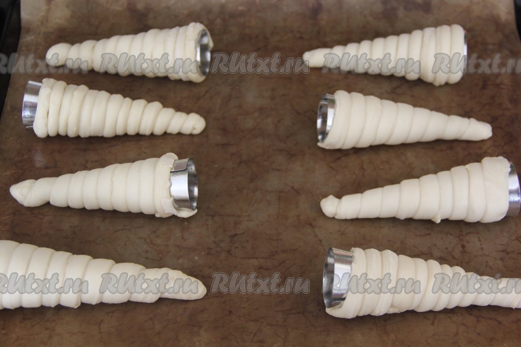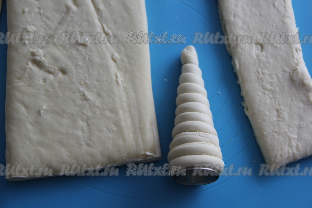 Размороженное тесто нарезать на длинные полоски шириной 1 см. Для формирования трубочек я использовала металлические конусы (их можно приобрести в магазинах).