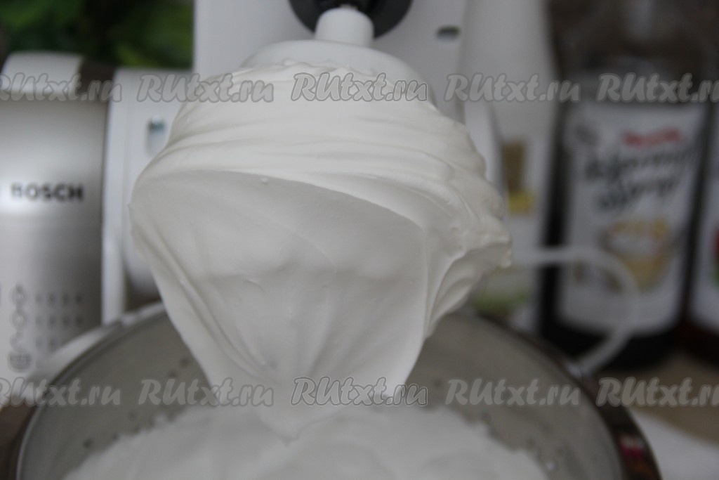 После того как добавите сироп, продолжайте взбивать белковый крем до плотного состояния, он должен хорошо держать форму (как на фото).