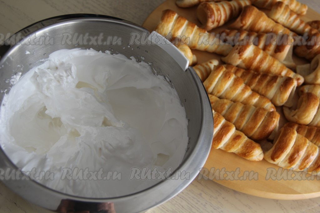 Белковый крем переложить в кулинарный мешок с фигурной насадкой и наполнить им слоёные трубочки.
