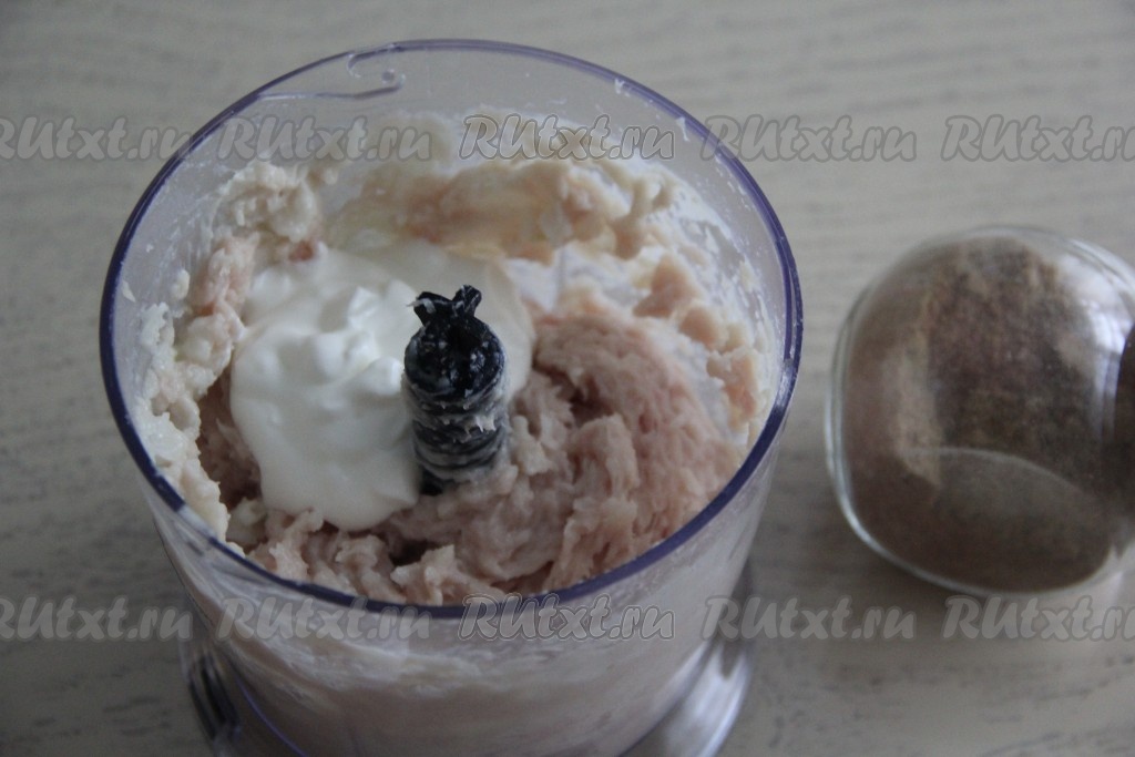 Вторую часть куриного филе выложить в чашу, добавить сметану и пробить до однородного состояния. Соединить две части фарша. Вместо измельчителя можно воспользоваться мясорубкой (перекрутите на мясорубке два раза куриное мясо и лук, а затем добавьте сметану и молоко).