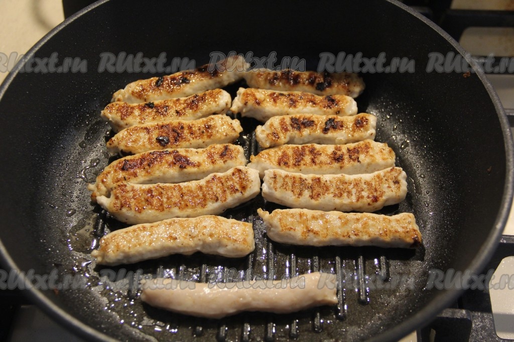 Сковороду (у меня гриль) смазать растительным маслом и разогреть. Отрезать кончик пакета или кулинарного мешка. Ширина срезанной части будет определять будущую ширину палочек. Отсадить куриную массу на сковороду, длину палочек можно сделать разную. Палочки быстро прихватываются на среднем огне. Как только палочки подрумянятся, перевернуть их на другую сторону. Обжарить палочки с двух сторон до золотистого цвета.