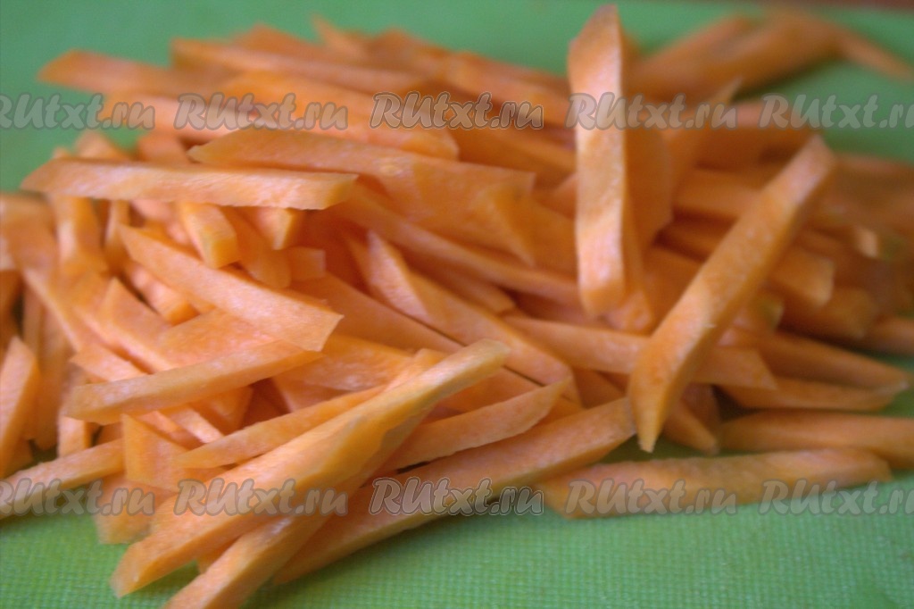 Тщательно промыть рис до прозрачности воды, дать лишней вод стечь. Морковь очистить и нарезать небольшими брусочками (если нет времени на нарезку морковки, тогда натрите её на крупной тёрке).