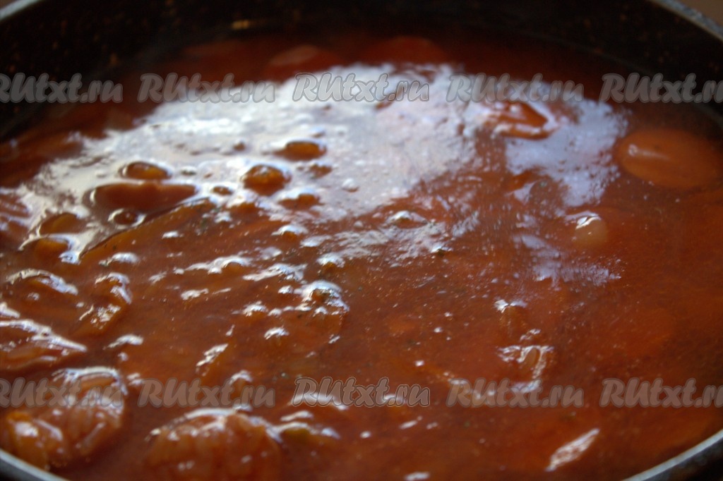 Затем к обжаренному луку, моркови и сосискам добавить томатную пасту, перемешать.