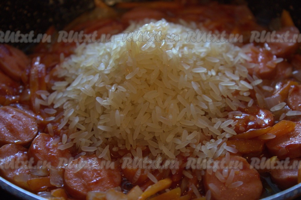 В сковороду к овощам и сосискам выложить рис, перемешать.
