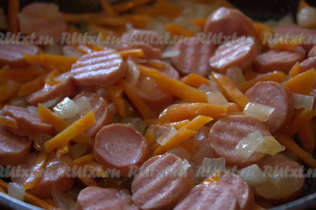 С сосисок снять плёнку (если она имеется), нарезать кружочками (очень тонко нарезать не нужно). Добавить сосиски в сковороду к овощам, перемешать хорошо и обжаривать на среднем огне минуты 3.