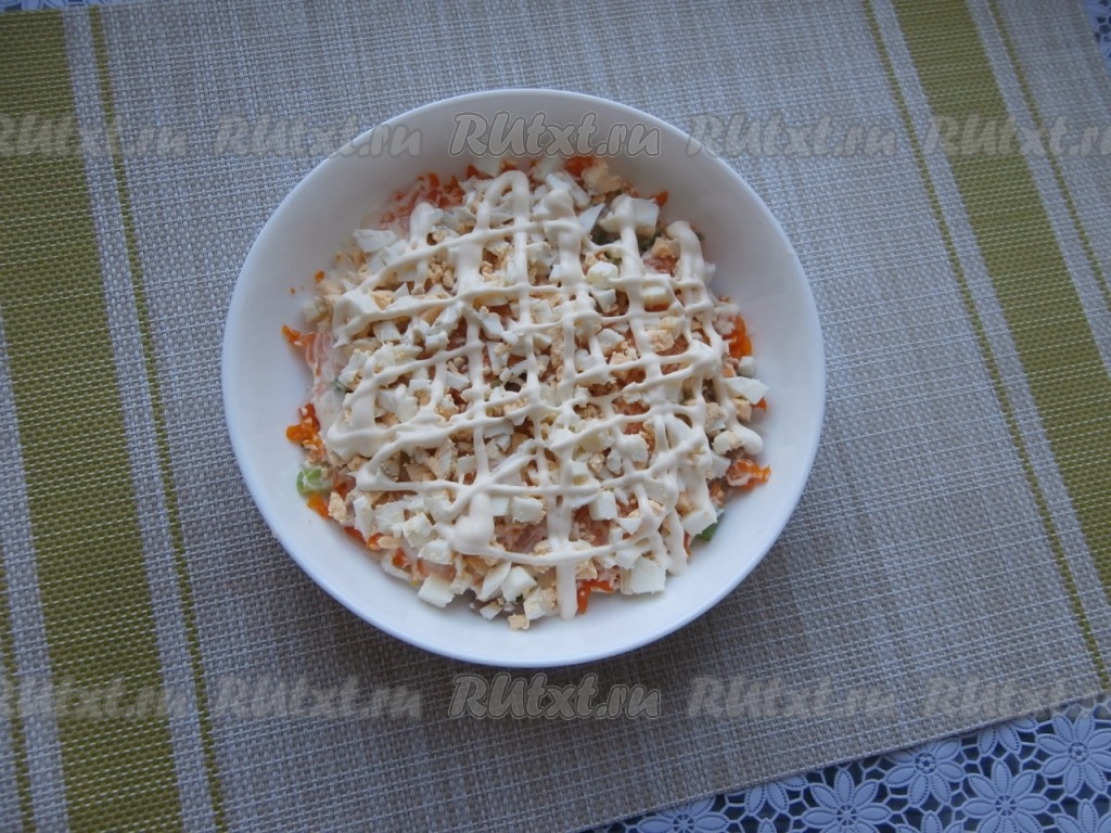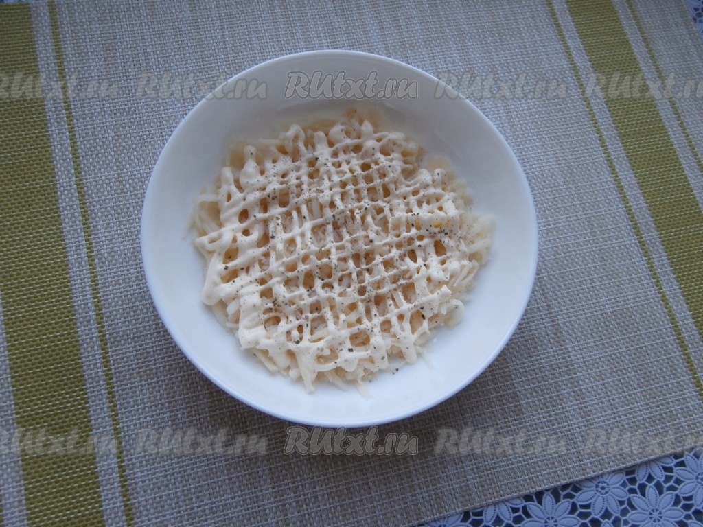 Следующим слоем выложить половину натёртой морковки, нанести сеточку из майонеза.