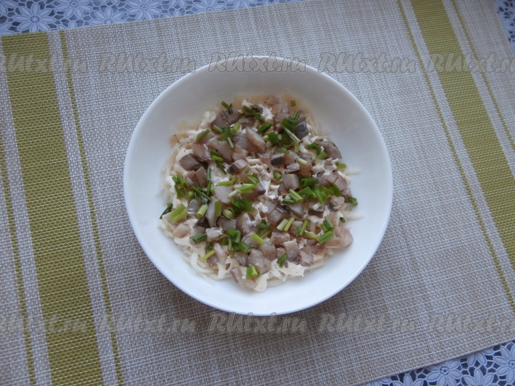 Далее выложить половину нарезанного небольшими кусочками филе селёдки и половину нарезанного зелёного лука.