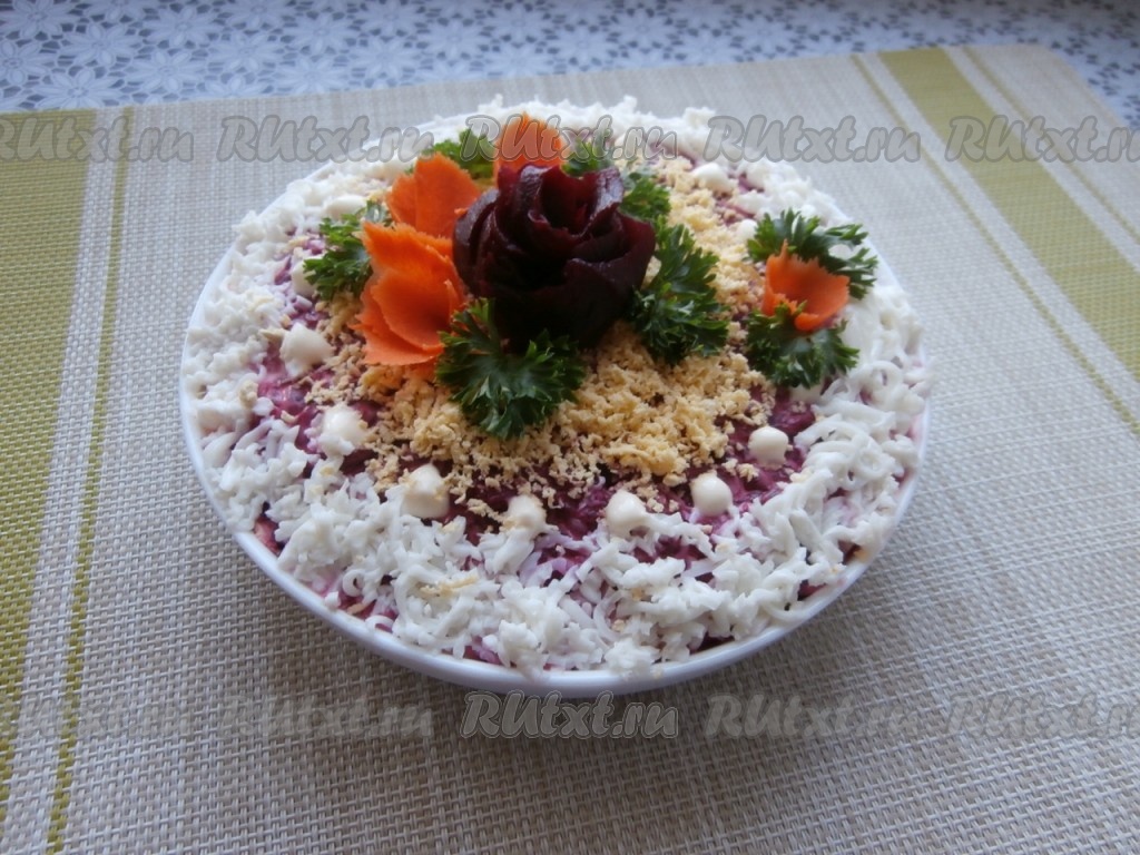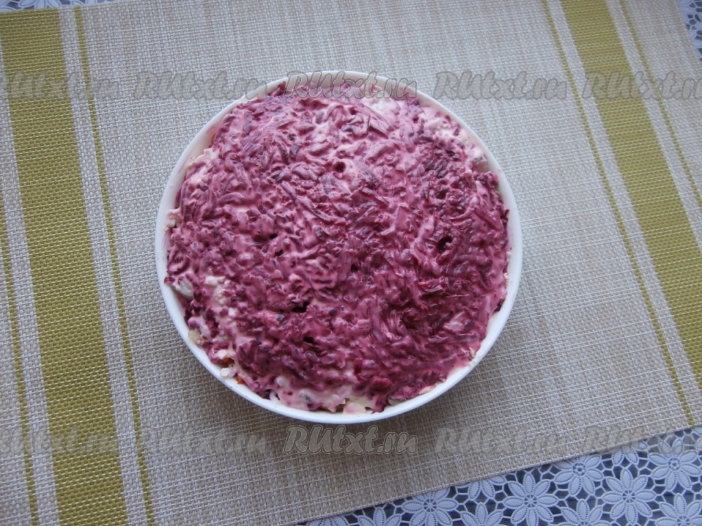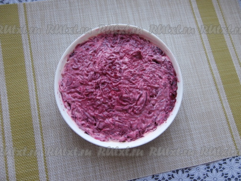 Далее идёт слой натёртой свеклы, который, по желанию, посолить, а затем смазать майонезом.