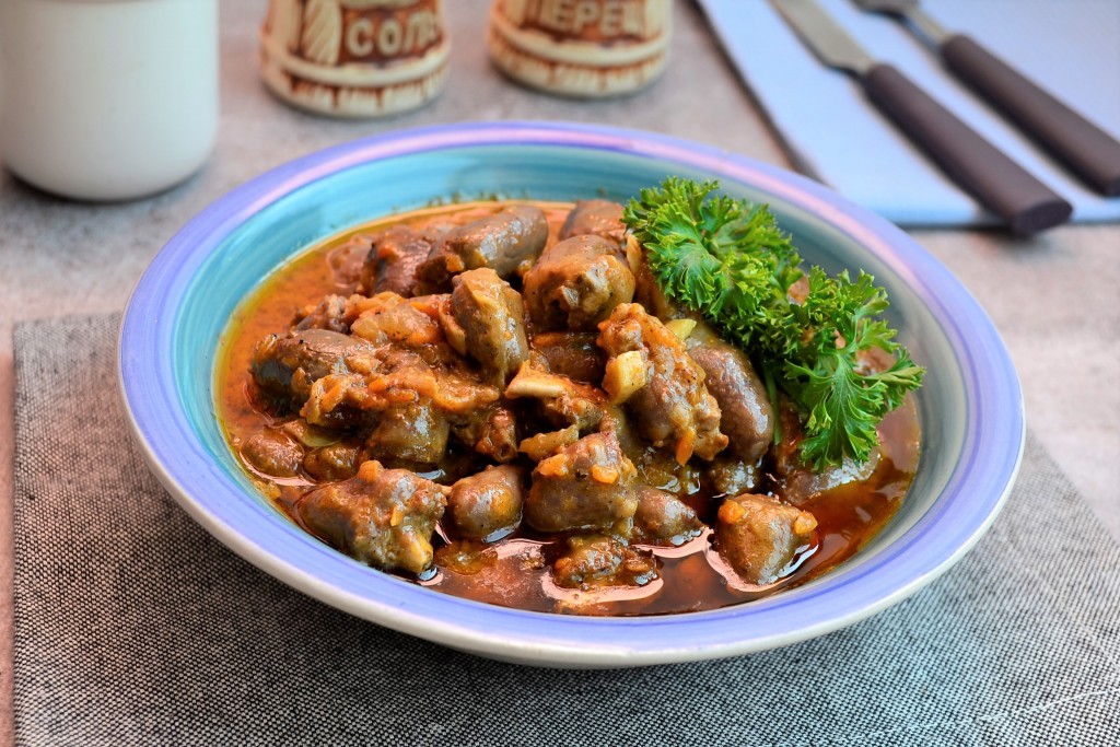 Необычайно вкусный, ароматный гуляш из куриных сердечек готов, подавать его можно вместе с подливкой, в которой он тушился, дополнив гарниром.