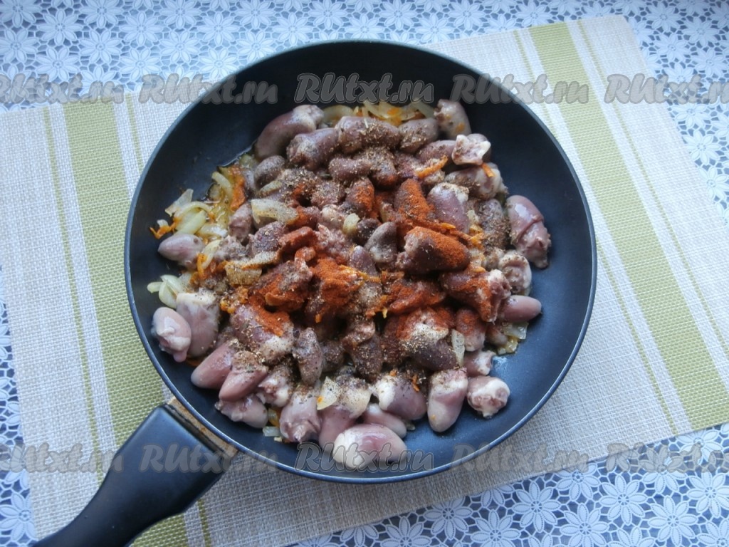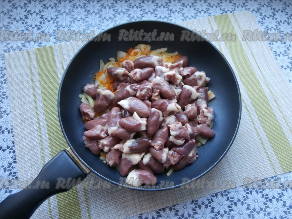 К луку сразу добавить очищенную и натёртую морковку. Обжарить, помешивая, овощи в течение 2-3 минут на среднем огне. Далее выложить в сковороду куриные сердечки.