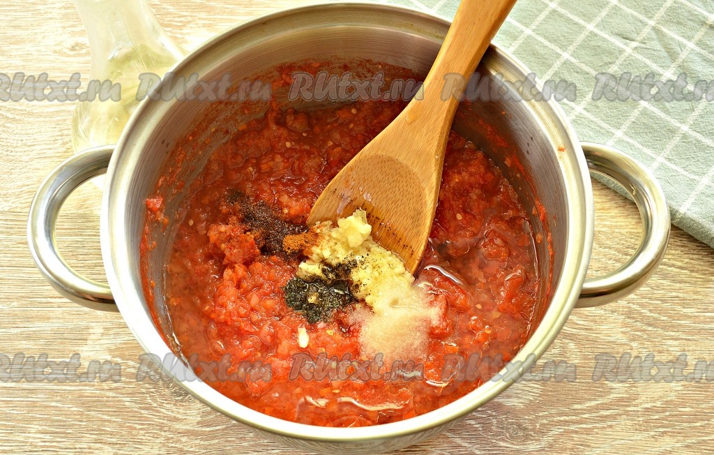 Масса в кастрюле уменьшится в объёме. Добавляем в неё красный и чёрный молотые перцы, пропущенный через пресс чеснок и соль, вливаем растительное масло и уксус, перемешиваем.