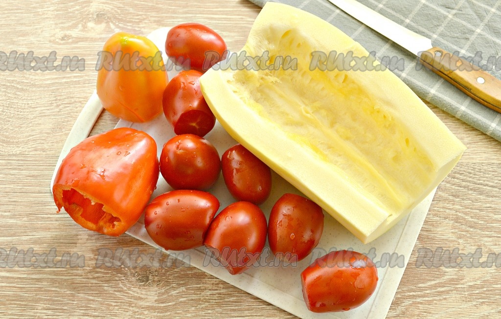 Кабачок очищаем от кожуры и семян. Промываем помидоры, срезаем место, в котором росла плодоножка. Из болгарских перцев удаляем семена с плодоножками, ополаскиваем.