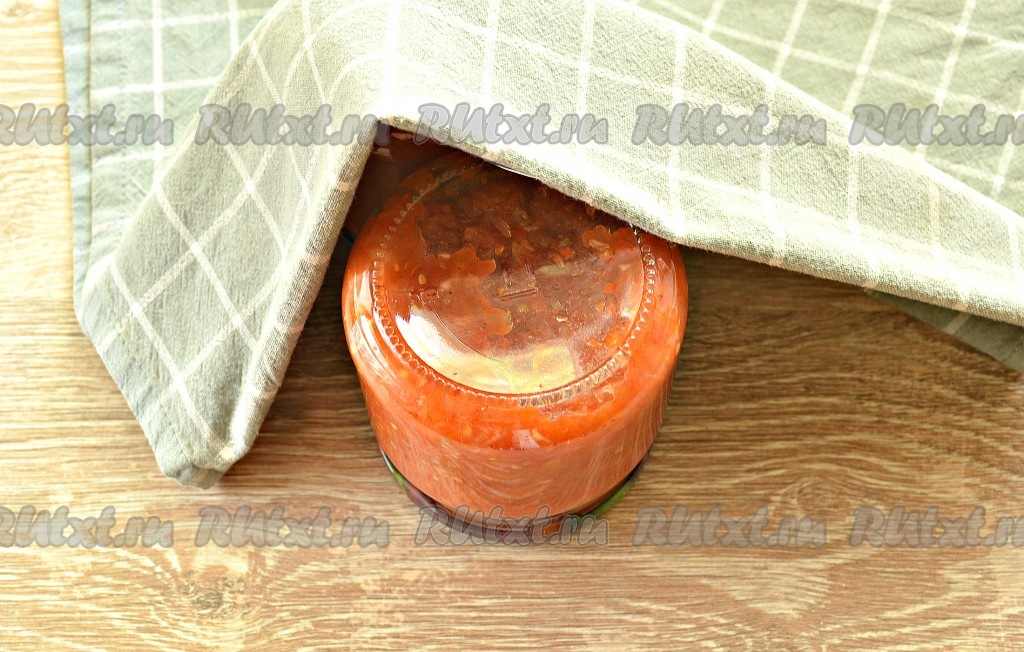 Банки с аджикой ставим на крышки (то есть переворачиваем вверх дном), хорошо укутываем в одеяло (или в плед) и оставляем до полного остывания (я оставляю на сутки).