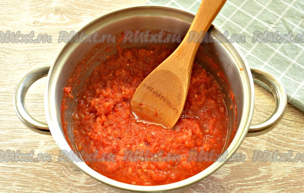 Получившуюся массу перекладываем в кастрюлю, затем ставим на средний огонь, а после закипания, убавив огонь, томим 30-35 минут, периодически перемешивая, чтобы овощи не прилипли ко дну кастрюли.