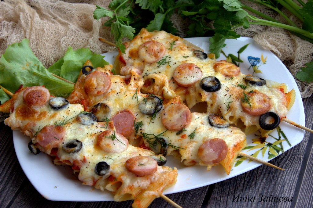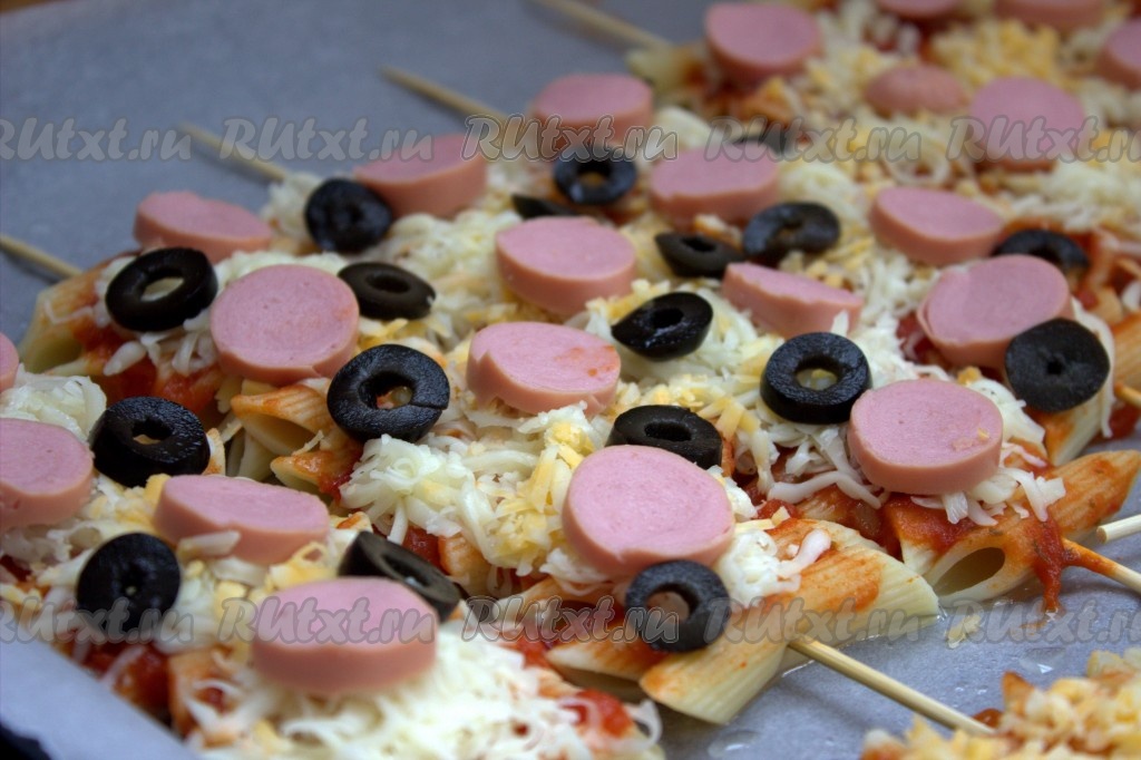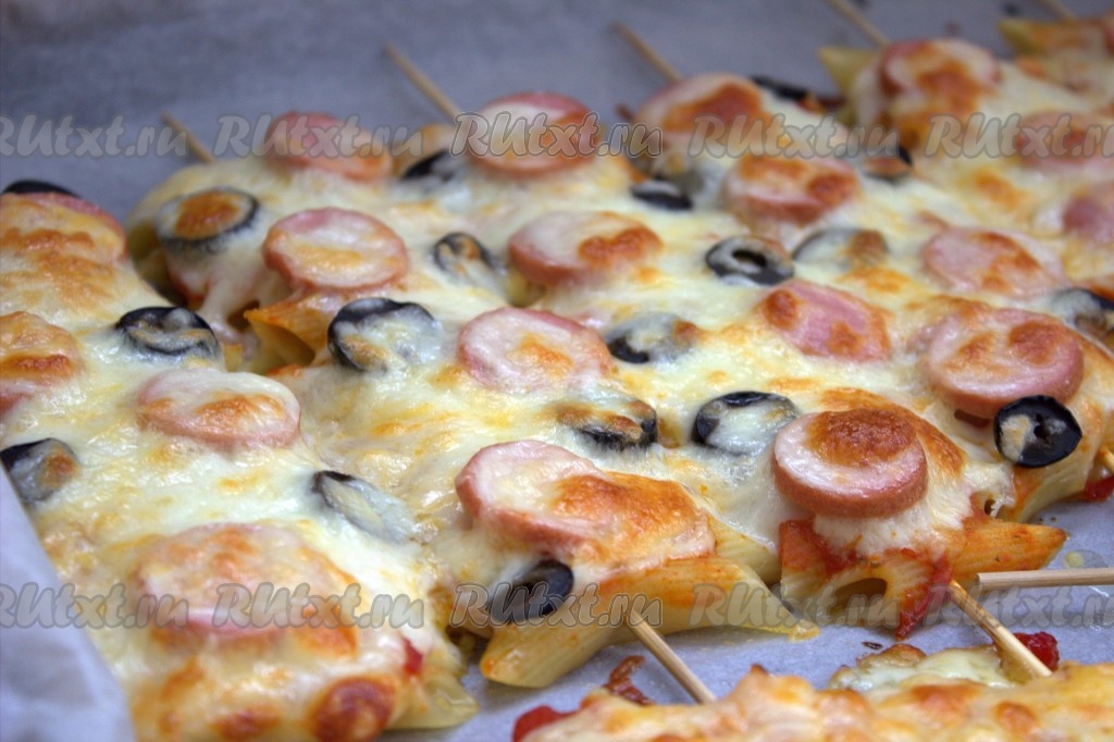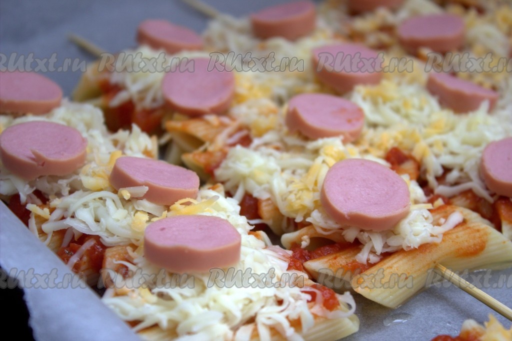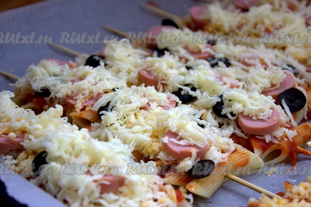 Запекать макароны на шпажках в заранее разогретой до 180 градусов духовке 10-15 минут (до золотистой, аппетитной корочки).