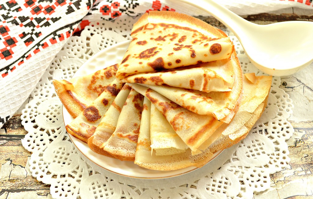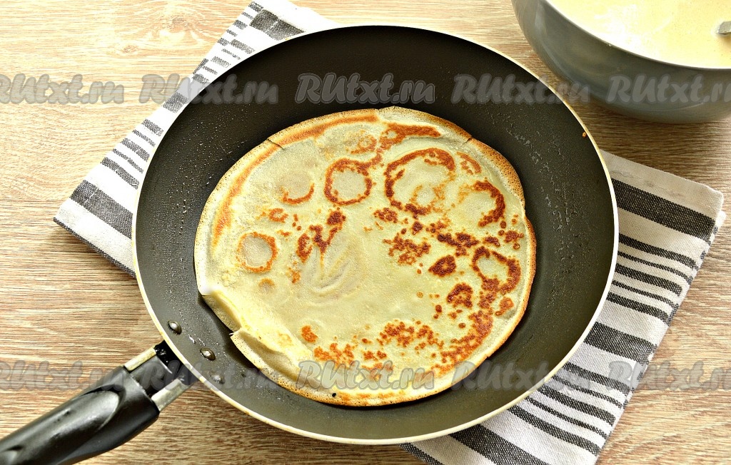 Поверхность сковороды для выпечки блинчиков смазываем маслом и очень хорошо прогреваем. Тесто зачерпываем половником и равномерно распределяем по дну сковороды. Жарим с одной стороны блин, примерно, 1 минуту. Затем аккуратно переворачиваем и жарим ещё секунд 45, а затем перекладываем на тарелку. Важно правильно установить нагрев плиты. Огонь должен быть чуть выше среднего. По мере выпечки блинов, тесто периодически перемешивайте, чтобы оно не застаивалось. Поверхность сковороды смазывайте маслом только по необходимости. Я готовила на сковороде диаметром 18 см, у меня получилось 20 блинчиков.