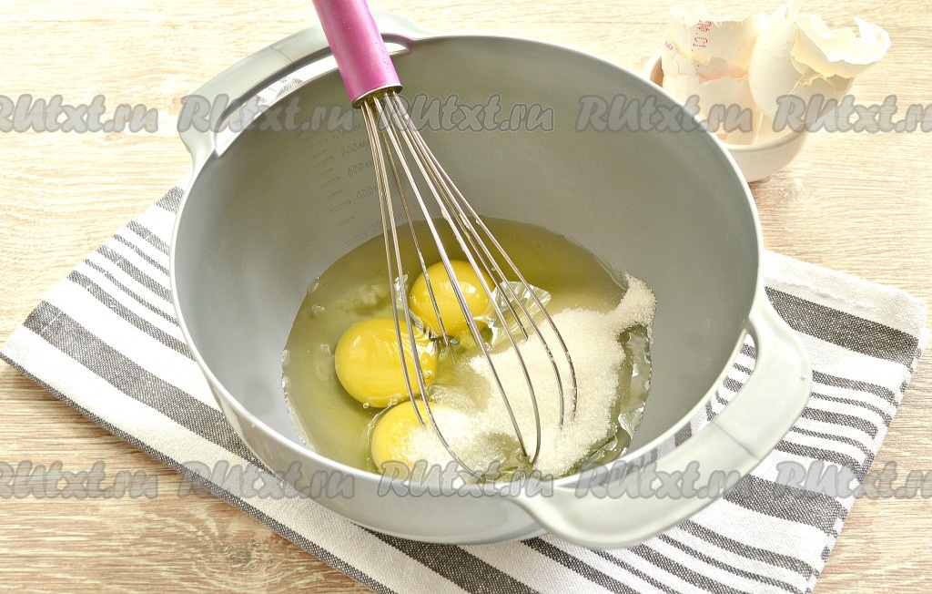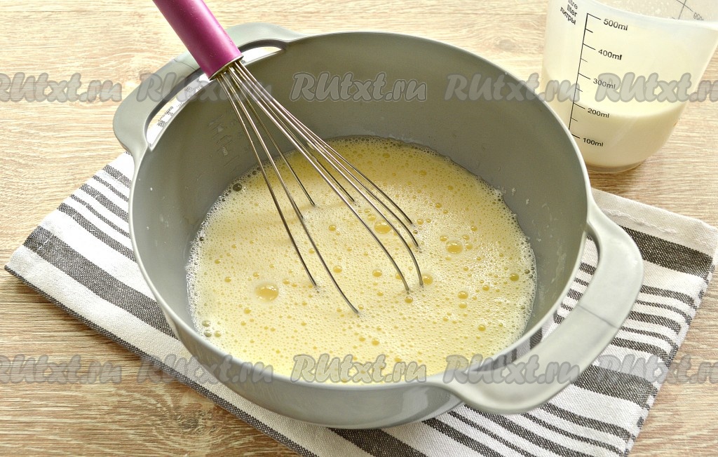 В миску с яйцами, сахаром и солью вливаем 1 стакан молока и хорошо перемешиваем ингредиенты ручным венчиком в течение 2-х минут. Должна получиться однородная смесь.
