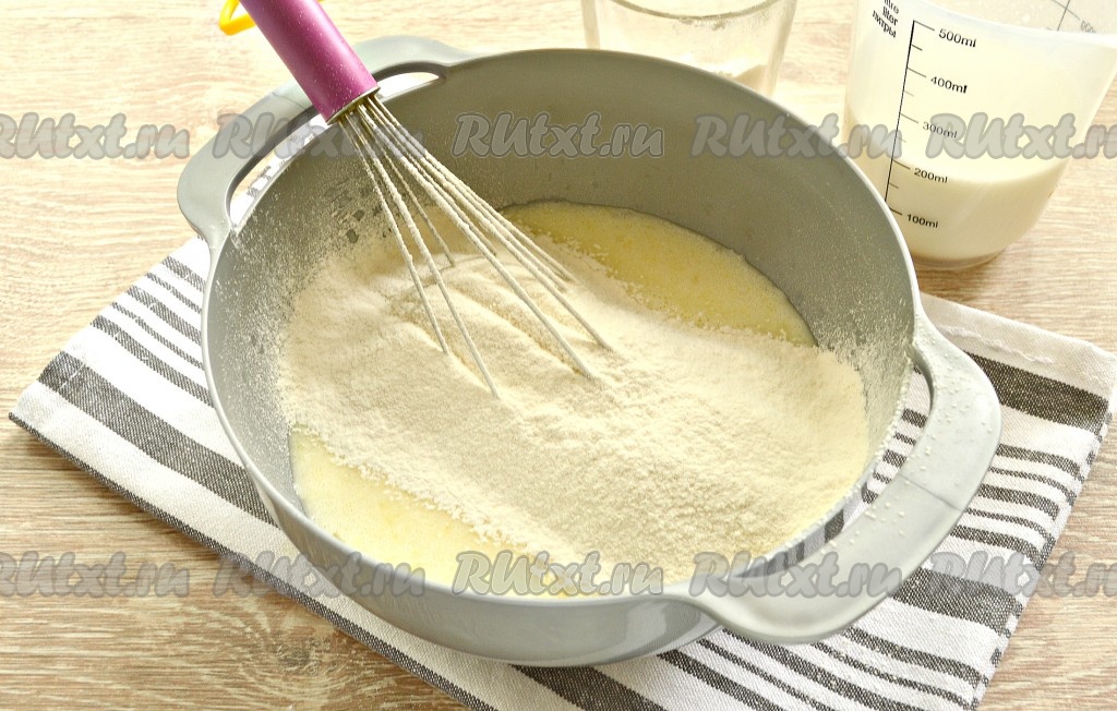 В тесто вливаем оставшийся стакан молока и снова хорошо перемешиваем ингредиенты венчиком.