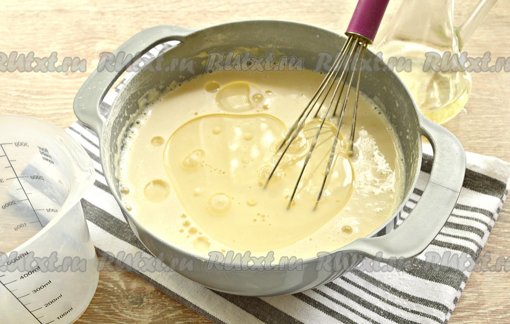 Далее вливаем в тесто тонкой струйкой стакан кипятка, постоянно перемешивая, затем добавляем растительное масло. Растительное масло добавляется для того, чтобы блинчики не прилипали к сковороде во время выпечки.