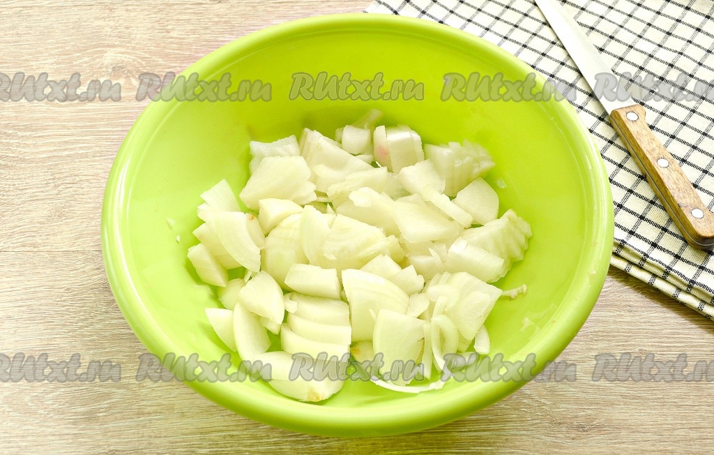 Крупные луковицы нарезаем четверть кольцами. Небольшие луковицы можно нарезать полукольцами.
