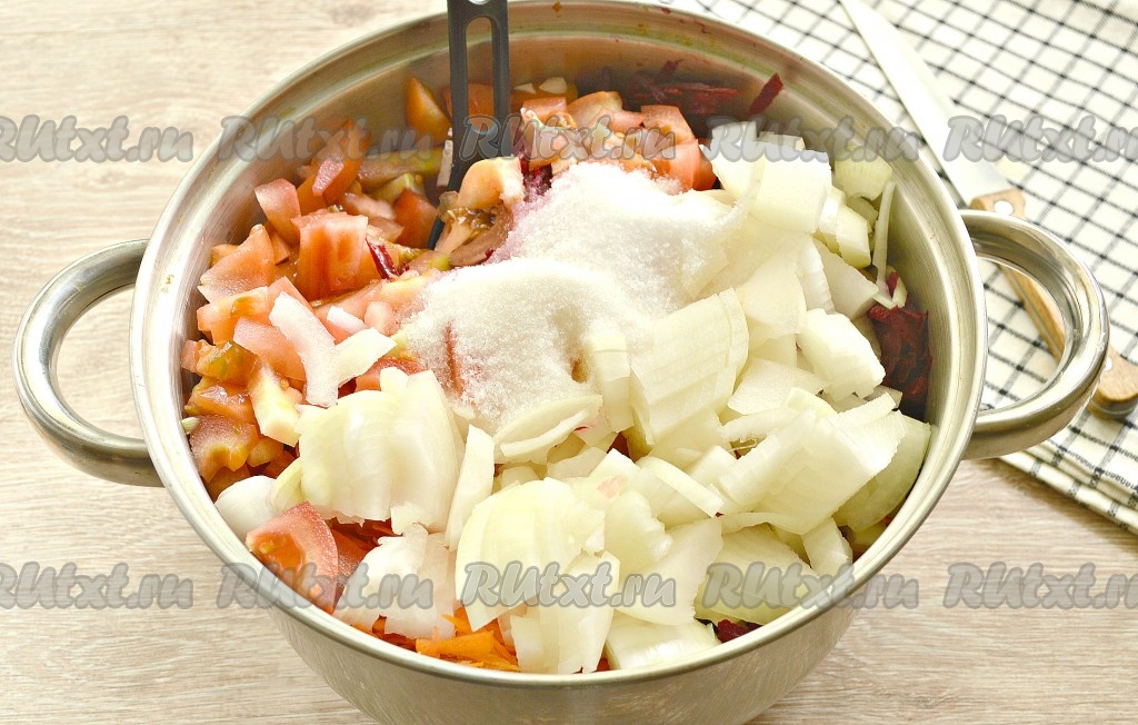Минут через 10-15 овощи пустят сок и осядут, в течение этого времени не забывайте периодически перемешивать содержимое кастрюли. Как только масса начнёт закипать, убавляем огонь и тушим овощи 25 минут, периодически перемешивая. В конце тушения вливаем уксус, перемешиваем и снимаем кастрюлю с огня.